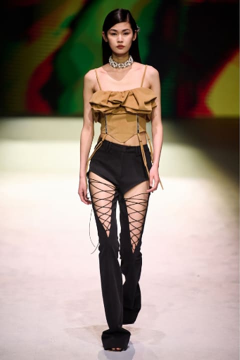 The SHIE LYU 23AW collection marked the closing show of Shanghai Fashion Week, while also being the first time the brand had participated in the event. The theme of the collection was "Land Mermaid" expressing a futuristic image of a powerful woman, and the hard, yet supple and eminently delicate texture of Ultrasuede® was the perfect choice of material to express this strong female image.